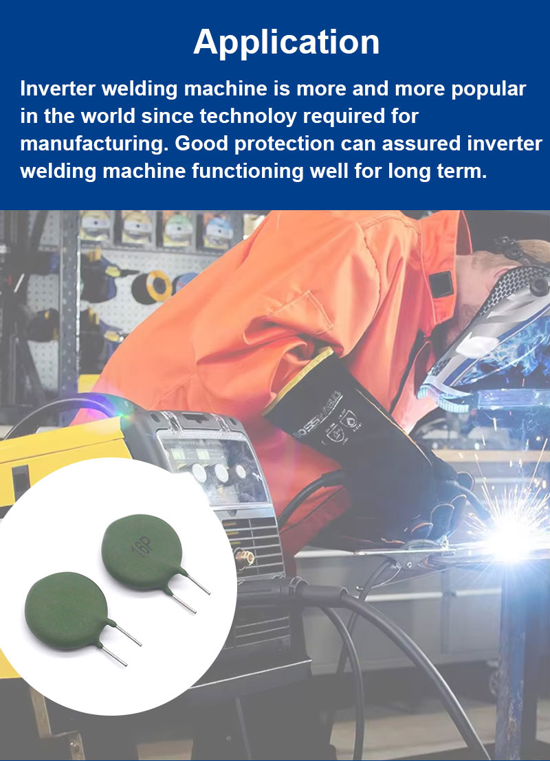 This series of PTC thermistors is primarily used in the power input circuit of inverter DC welding machines. A typical application circuit connects them in series between the AC input line and the rectifier bridge. At power-on, they function as a current-limiting resistor. Subsequently, the welding machine's mainboard controls a parallel relay or thyristor to energize, shorting the high-resistance PTC, allowing the main current to flow through the relay contacts and ensuring full welder power output. Consequently, they are widely used in the power modules of 15P, 16P, and 19P inverter welding and cutting machines, as well as various other MOSFET/IGBT inverters. They are essential protection components in modern welding machine designs.