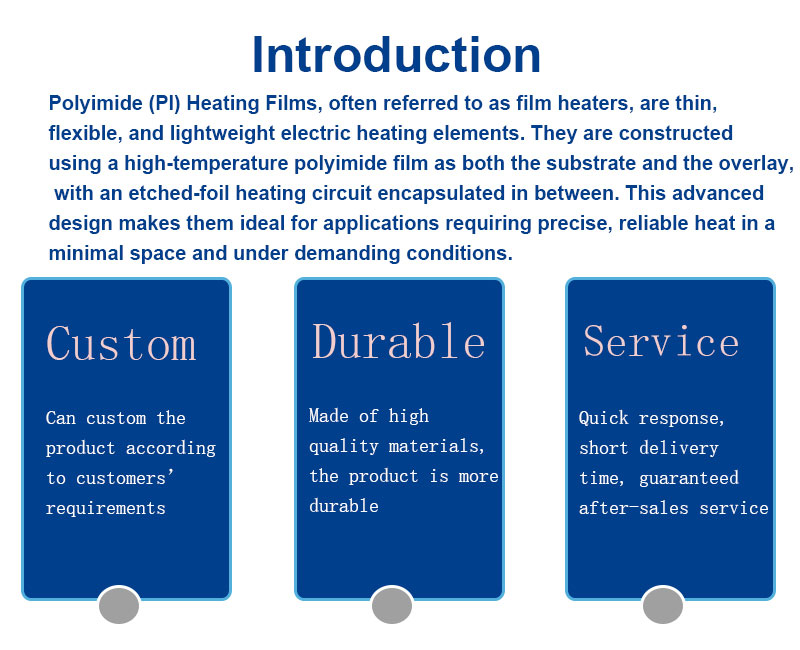 Polyimide (PI) Heating Films, often referred to as film heaters, are thin, flexible, and lightweight electric heating elements. They are constructed using a high-temperature polyimide film as both the substrate and the overlay, with an etched-foil heating circuit encapsulated in between. This advanced design makes them ideal for applications requiring precise, reliable heat in a minimal space and under demanding conditions.