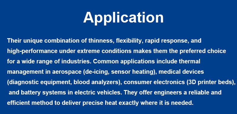In summary, Polyimide Heating Films represent a premium heating solution where conventional heaters are too bulky, rigid, or unreliable. Their unique combination of thinness, flexibility, rapid response, and high-performance under extreme conditions makes them the preferred choice for a wide range of industries. Common applications include thermal management in aerospace (de-icing, sensor heating), medical devices (diagnostic equipment, blood analyzers), consumer electronics (3D printer beds), and battery systems in electric vehicles. They offer engineers a reliable and efficient method to deliver precise heat exactly where it is needed.