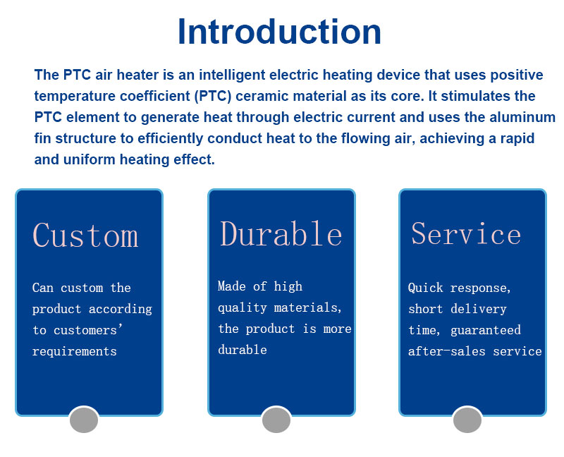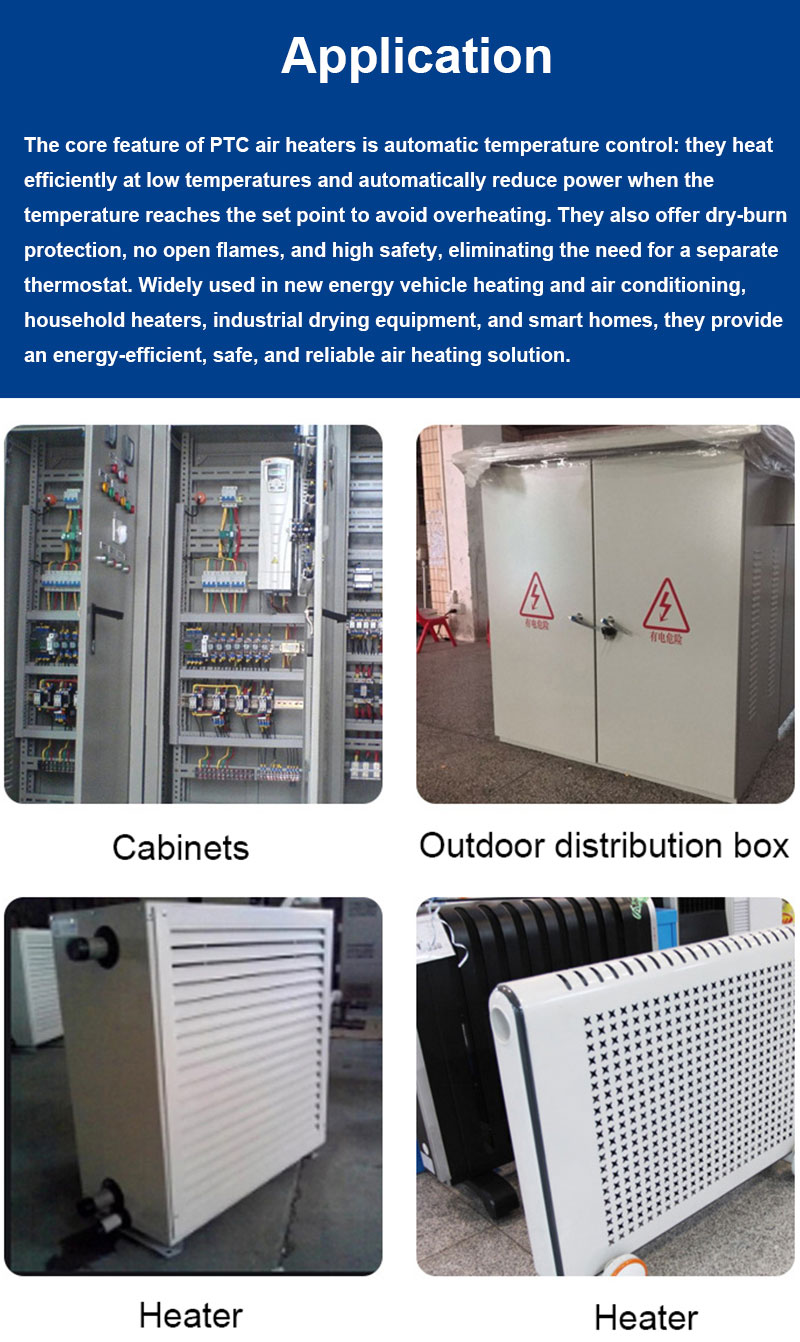 The Insulated Corrugated PTC Air Heater is a high-performance heating device that combines advanced PTC (positive temperature coefficient) material technology, a corrugated heat dissipation structure, and multiple insulation protections. Designed for applications with stringent requirements for safety and thermal efficiency, this product achieves a perfect combination of heating performance and safety features through innovative structural design and material processing.