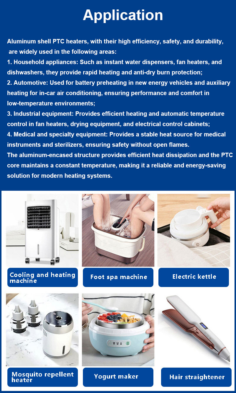 Grazie alla loro sicurezza, efficienza e durata, i riscaldatori PTC con guscio in alluminio sono ampiamente utilizzati in: