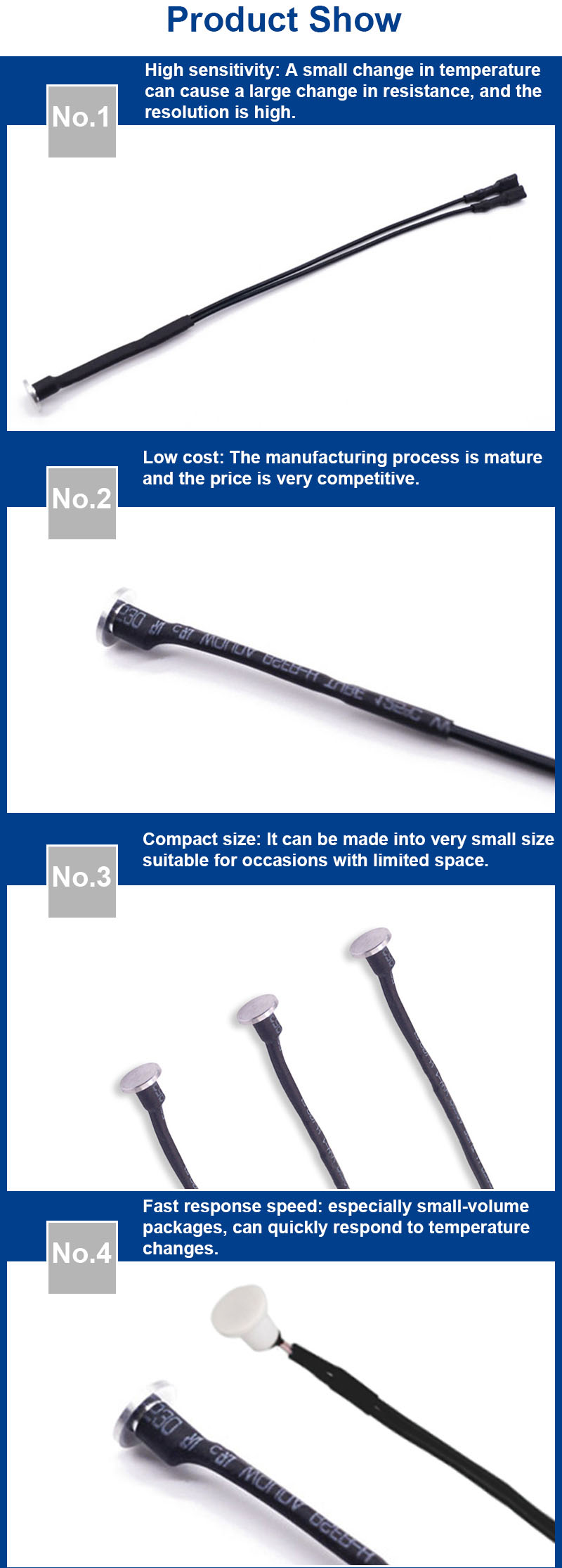 I termistori NTC hanno un coefficiente di temperatura elevato (in genere da -3% a -6%/°C) all'interno dell'intervallo di temperatura normale, consentendo il rilevamento rapido di piccole variazioni di temperatura e garantendo un'elevata precisione di misurazione.