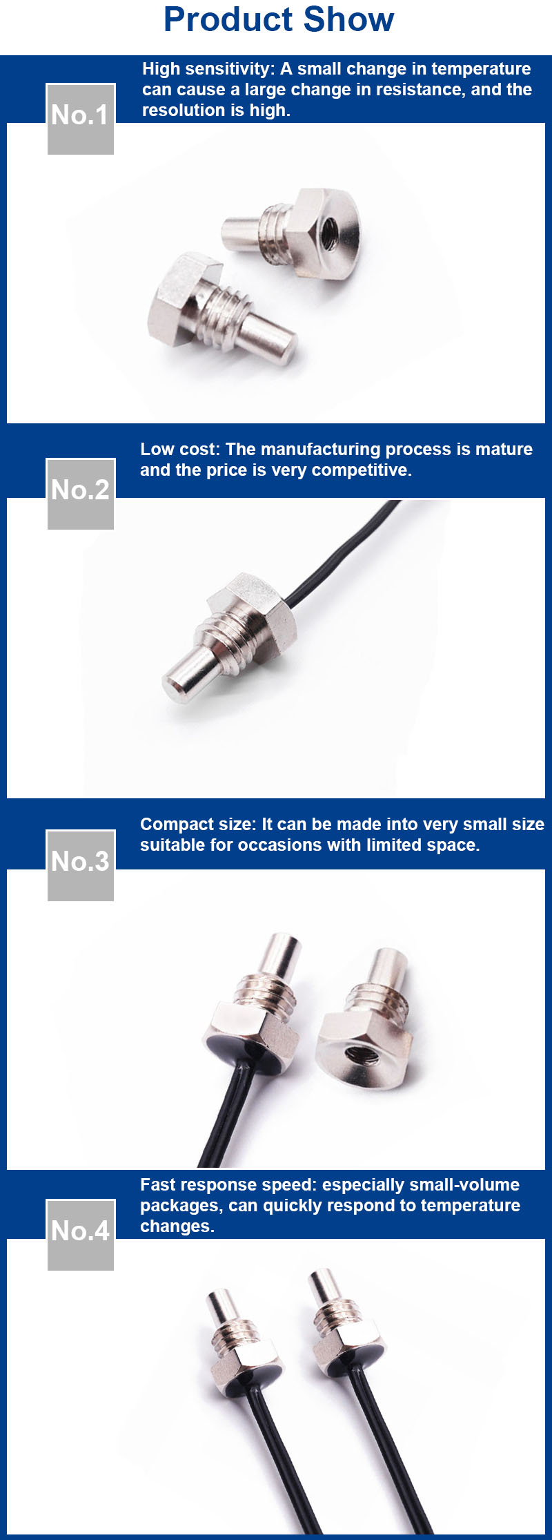 Opzioni flessibili: sono disponibili diverse dimensioni di filettatura, lunghezze di sonda, tipi di cavi e interfacce elettriche, ed è possibile integrare diversi elementi di rilevamento, come termistori NTC, termometri a resistenza di platino PT100 o termocoppie, per soddisfare diversi requisiti applicativi.