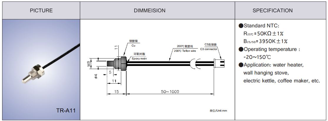 | NTC standard | R25℃=50KΩ±1% |