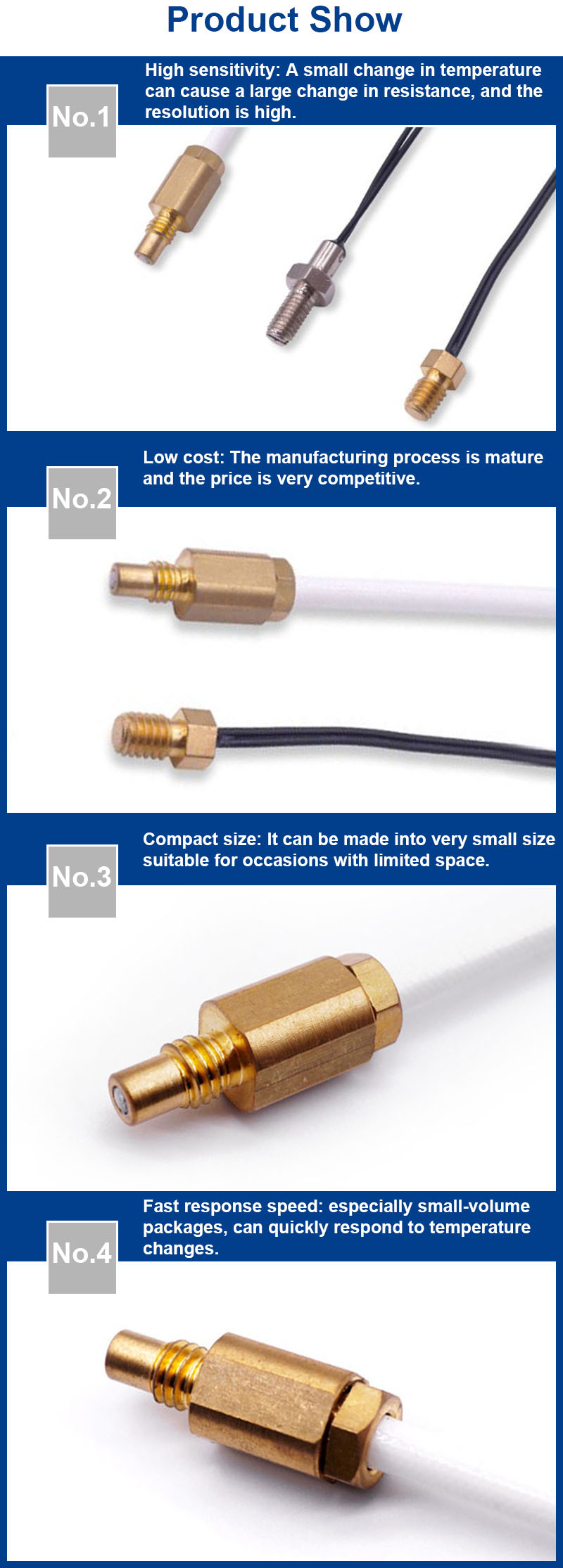 Opzioni flessibili: sono disponibili diverse dimensioni di filettatura, lunghezze di sonda, tipi di cavi e interfacce elettriche, ed è possibile integrare diversi elementi di rilevamento, come termistori NTC, termometri a resistenza di platino PT100 o termocoppie, per soddisfare diversi requisiti applicativi.