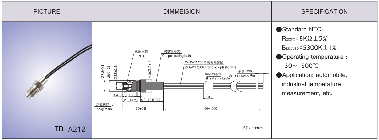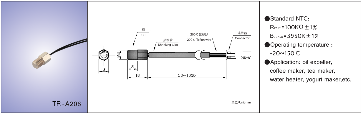 | NTC standard | R25℃=8KΩ±1% |