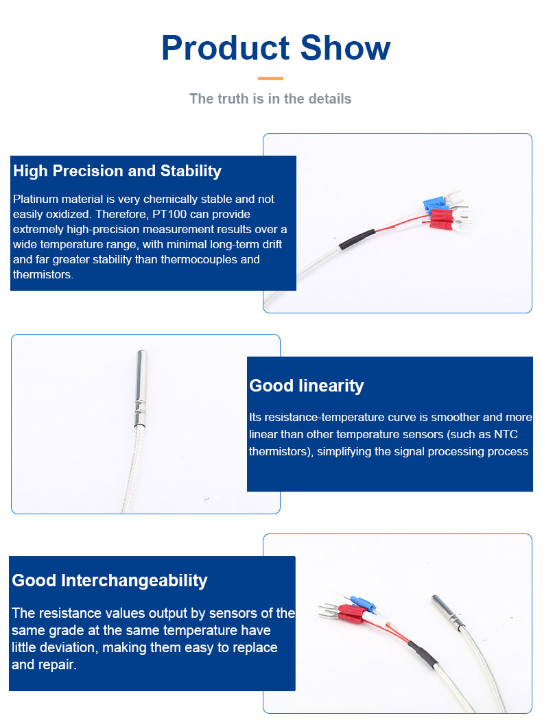넓은 온도 범위: 표준 PT100은 일반적으로 -200°C ~ +850°C의 측정 범위를 제공하며, 특수 구성으로 확장할 수 있습니다. 저온 및 중온에서 정밀 측정에 탁월합니다.