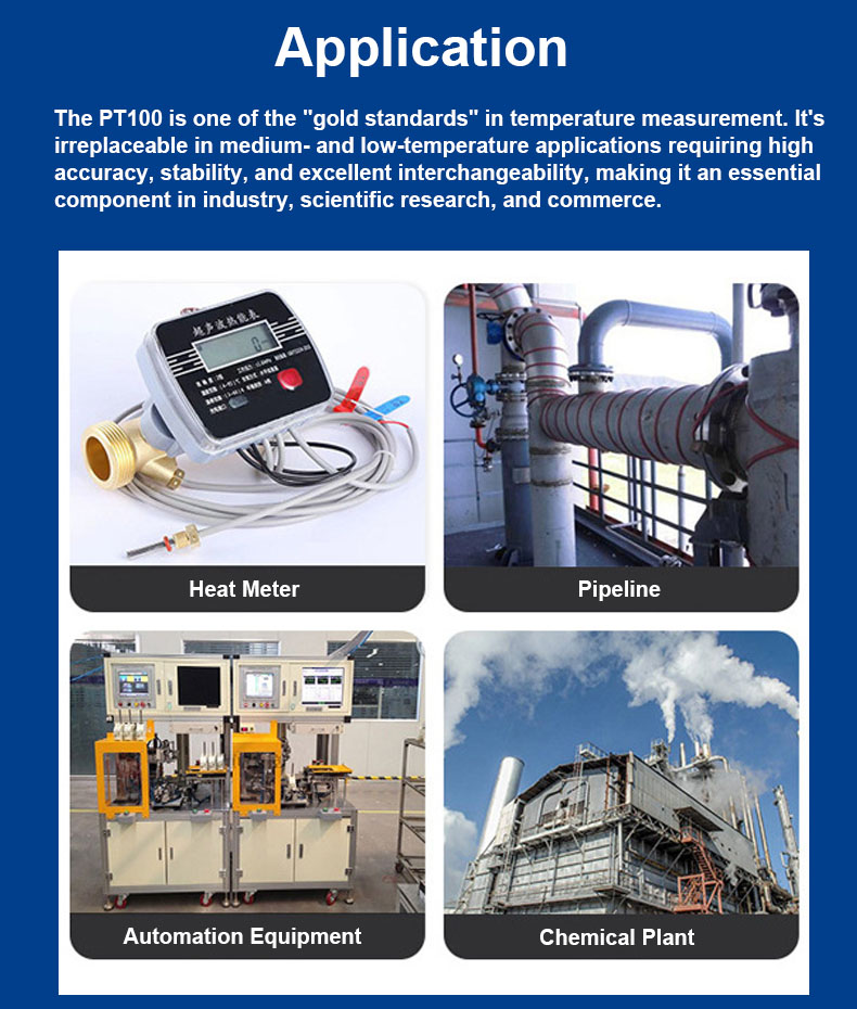뛰어난 호환성: 국제 표준(예: IEC 60751)에 따라 제조된 PT100은 뛰어난 호환성을 제공합니다. 즉, 동일한 등급의 센서는 동일한 온도에서 저항 출력의 편차가 최소화되므로 교체 및 수리가 용이합니다.