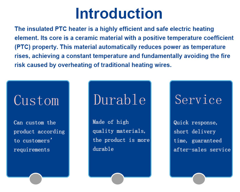 랩어라운드 PTC 발열체는 정온 PTC 저항 발열체를 기반으로 하며, 구조에 따라 알루미늄 쉘 PTC 발열체와 절연 튜브 PTC 발열체로 구분됩니다. 자동 정온 제어 기능을 갖추고 있어 온도 조절 장치가 필요 없습니다. 낮은 누설 전류, 안전성, 신뢰성, 그리고 긴 수명을 제공합니다. 온도 조절 장치 없이도 일정한 온도를 유지하고, 높은 절연 강도, 넓은 전압 범위, 그리고 유연한 치수를 자랑합니다. 또한, 고객의 요구에 맞춰 다양한 모델과 사양을 맞춤 제작할 수 있습니다. 이 발열체는 넓은 전압 범위(12V~240V)와 넓은 표면 온도 범위(70~295°C)를 제공합니다.