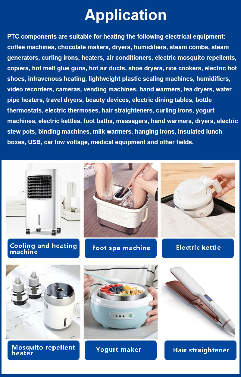 주요 적용 분야: 커피 머신, 장난감, 물리 치료 장비, 라미네이터, 헤어 스트레이트너, 컬링 아이언, 헤어 클립, 전기 헤어 클립, 전기 가열 집게, 스팀 빗, 전기 컬링 아이언, 전기 다리미, 보온 도시락 상자, 전기 다리미, 가정용 오일 프레스, 왁스 용해기, 핫멜트 접착제 제조기, 보온컵, 초콜릿 제조기, 전기 납땜 인두 및 기타 전기 가열 장비.