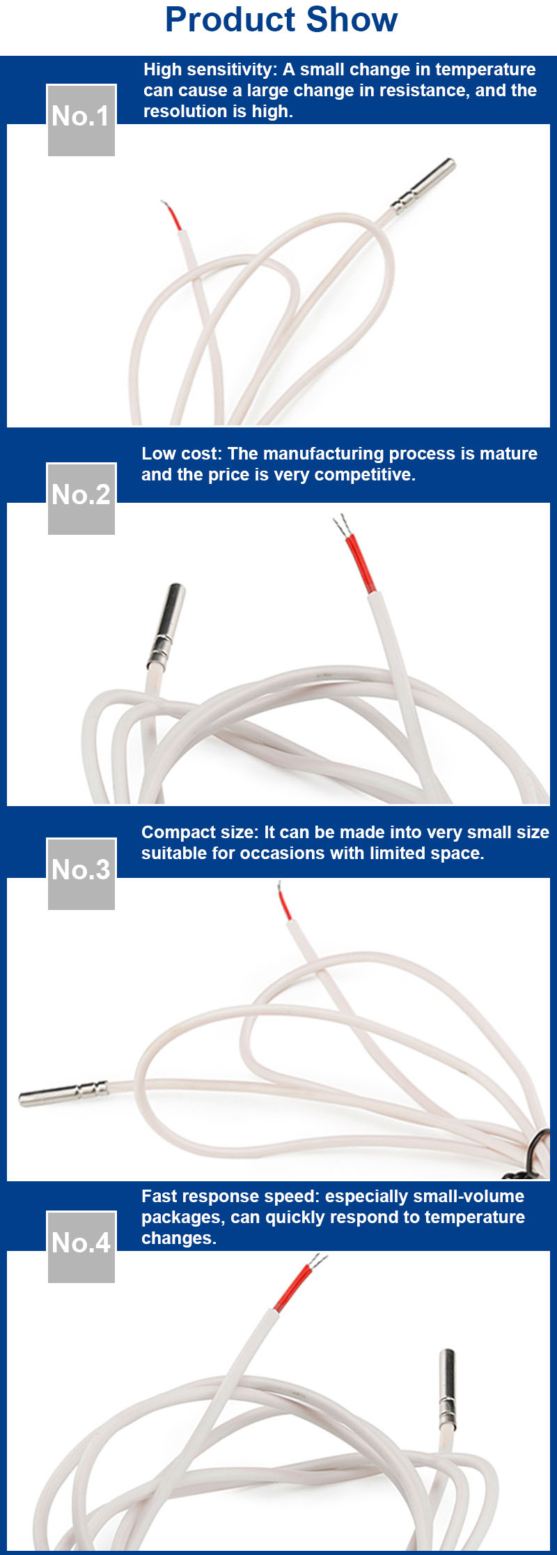 NTC thermistors have a high temperature coefficient (typically -3% to -6%/°C) within the normal temperature range, enabling rapid detection of small temperature changes and providing high measurement accuracy.