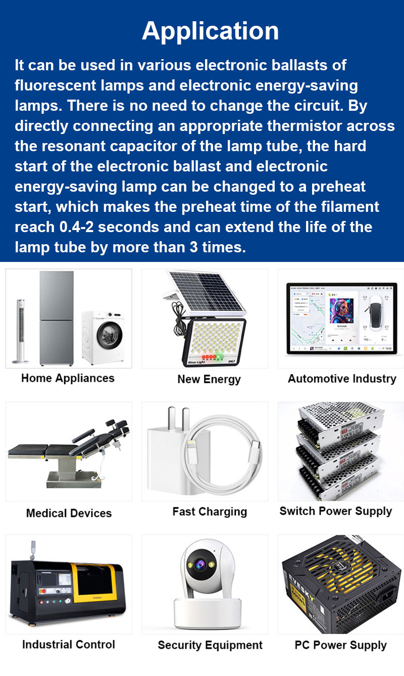 It is mainly used in electronic energy-saving lamps (CFL), fluorescent lamp electronic ballasts, LED drivers as surge suppression (but the principle is different), etc.