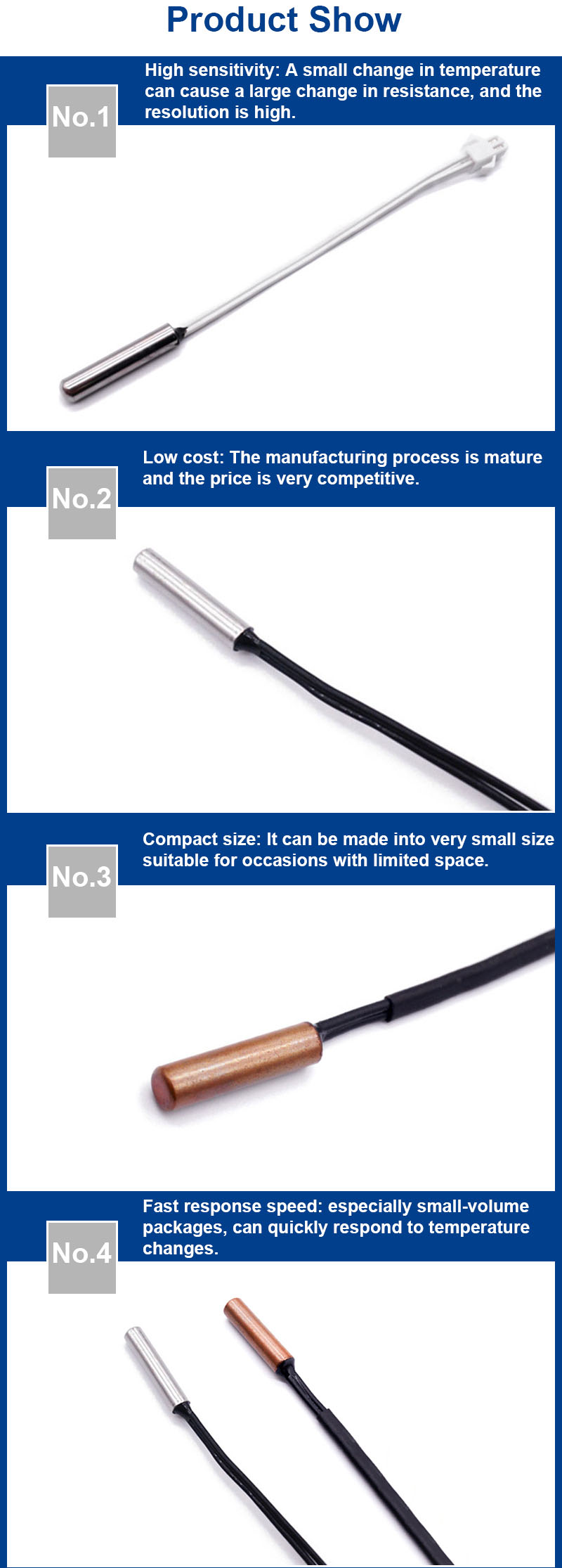 NTC termistörleri normal sıcaklık aralığında yüksek bir sıcaklık katsayısına (tipik olarak -%3 ila -%6/°C) sahiptir, bu da küçük sıcaklık değişimlerinin hızlı bir şekilde tespit edilmesini ve yüksek ölçüm doğruluğu sağlar.