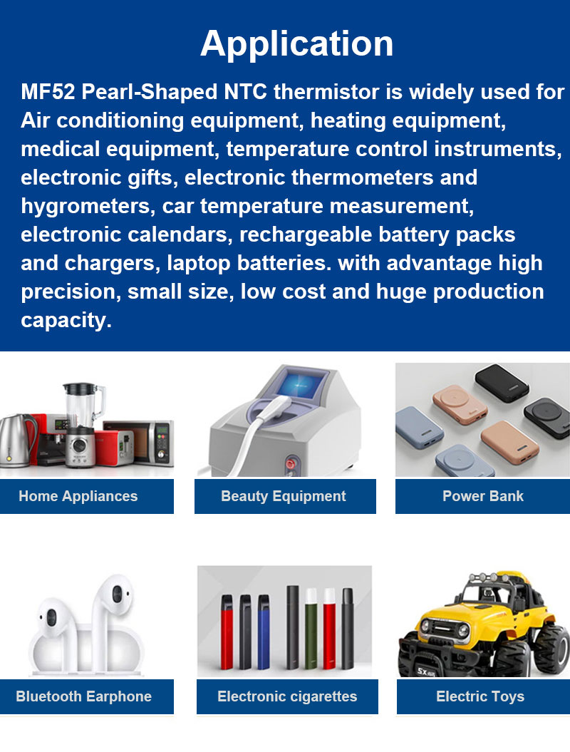 Pearl-Shaped Precision NTC Thermistor for Temperature Measurement The MF52 series of Pearl-Shaped NTC Thermistors is ethoxyline resin coated. The small size is made possible by new materials and manufacturing methods which provide the benefit of close tolerances and fast response. MF52 thermistors are available with 5 lead styles in standard or custom lengths.