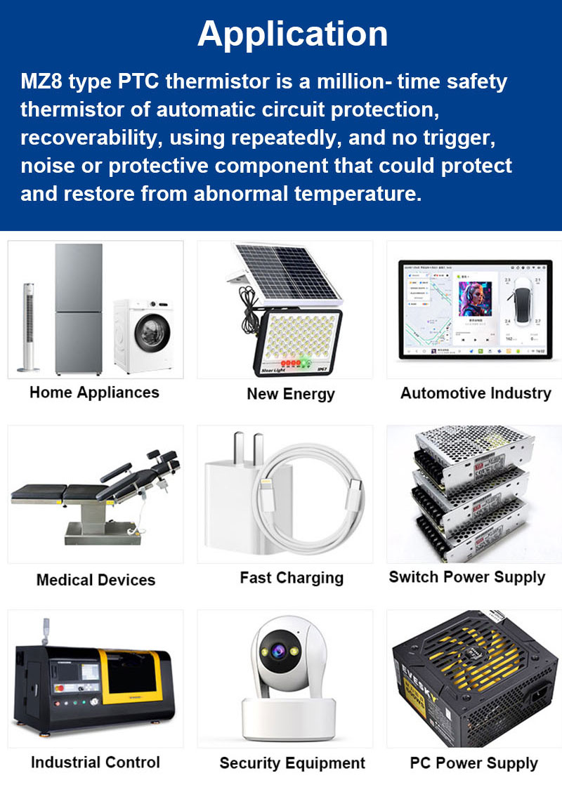 MZ8系列PTC热敏电阻是一种百万次安全热敏电阻,具有自动电路保护、可恢复、可重复使用、无触发、无噪音、无保护元件,可在温度异常时进行保护和恢复。